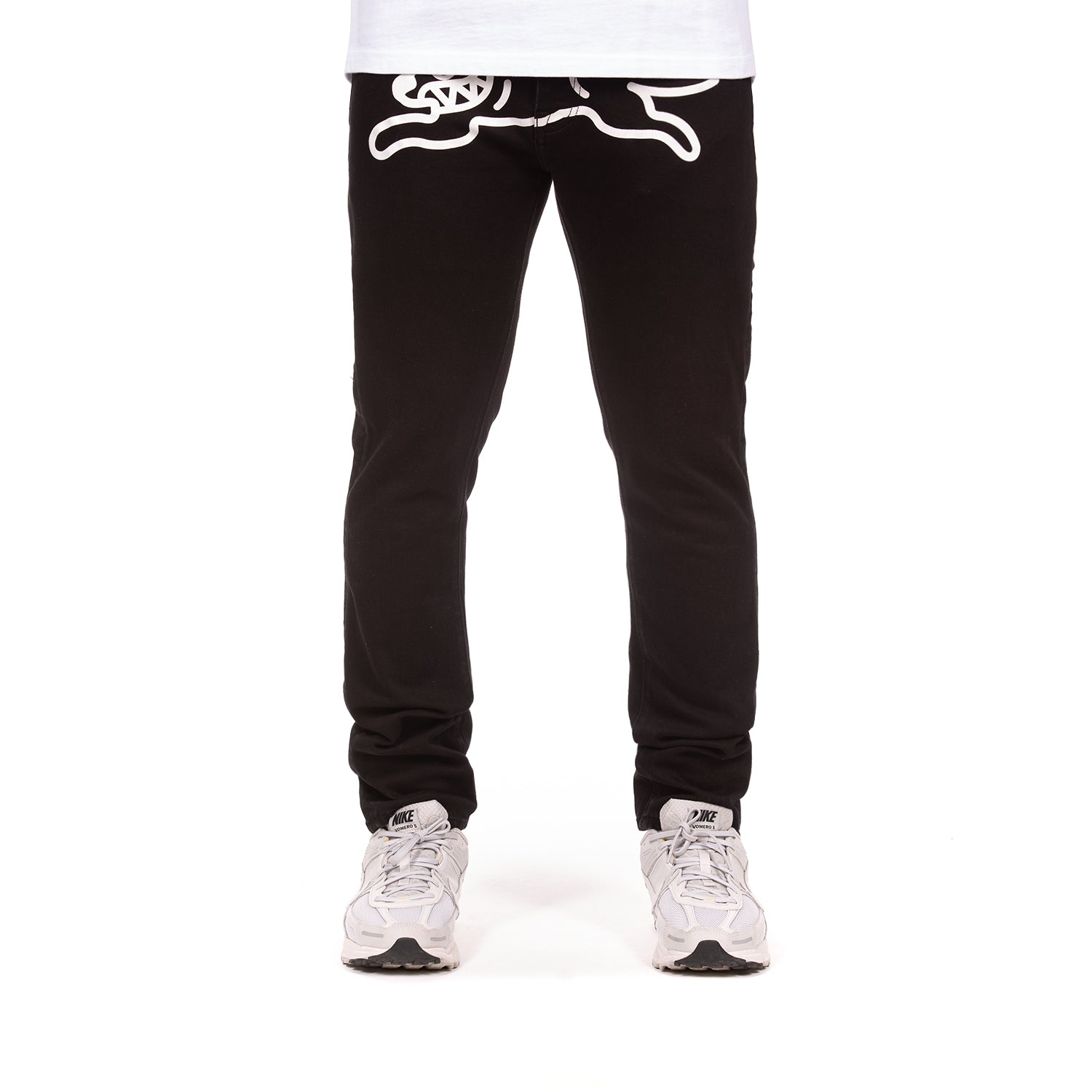 - These Icecream BBC jeans feature the iconic running dog design screen-printed across the lap. On the front side, these jeans feature belt loops, a four-button closure, 2 slit pockets, and 1 coin pocket. On the back side, there are 2 slit pockets.